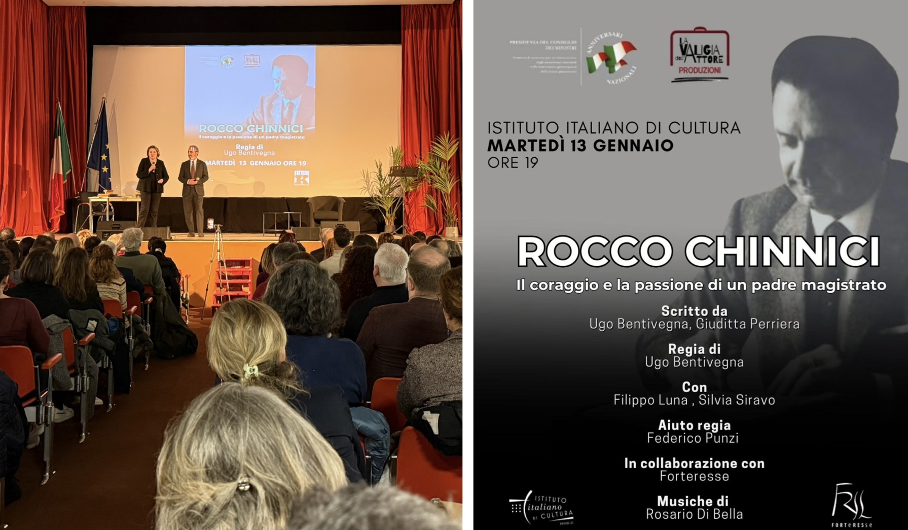Il 13 gennaio 2026, presso l’Istituto Italiano di Cultura di Bruxelles, si è tenuto uno spettacolo teatrale di alto valore civile e istituzionale: “Rocco Chinnici. Il coraggio e la passione di un padre magistrato”, scritto e diretto da Ugo Bentivegna e interpretato con rigore e intensità da Filippo Luna e Silvia Siravo.