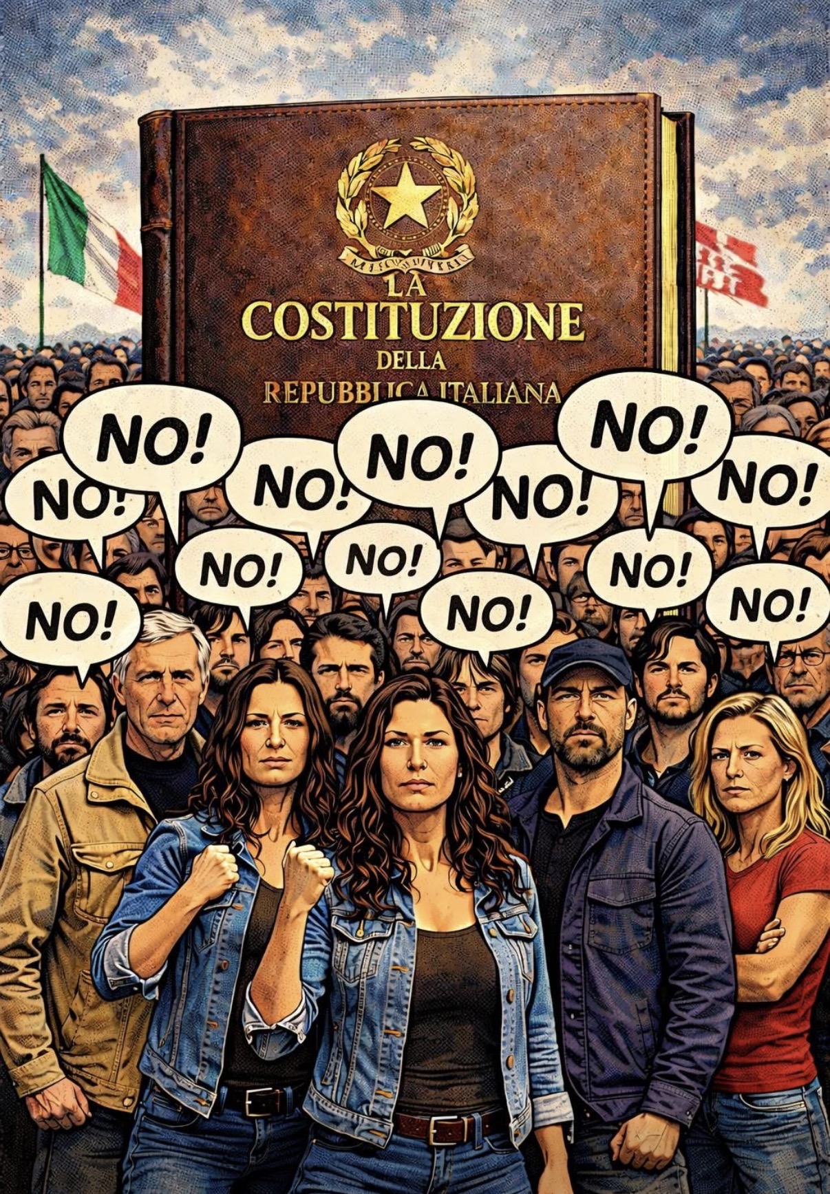 In queste settimane, sui social network e nel dibattito pubblico circolano immagini e messaggi che invocano la “difesa della Costituzione” per giustificare un rifiuto netto delle riforme sulla giustizia. Tra queste, spicca una rappresentazione simbolicamente potente: una folla che urla “NO!”, pugni serrati, mentre alle spalle troneggia la Costituzione della Repubblica italiana, trasformata in un baluardo contro il cambiamento.